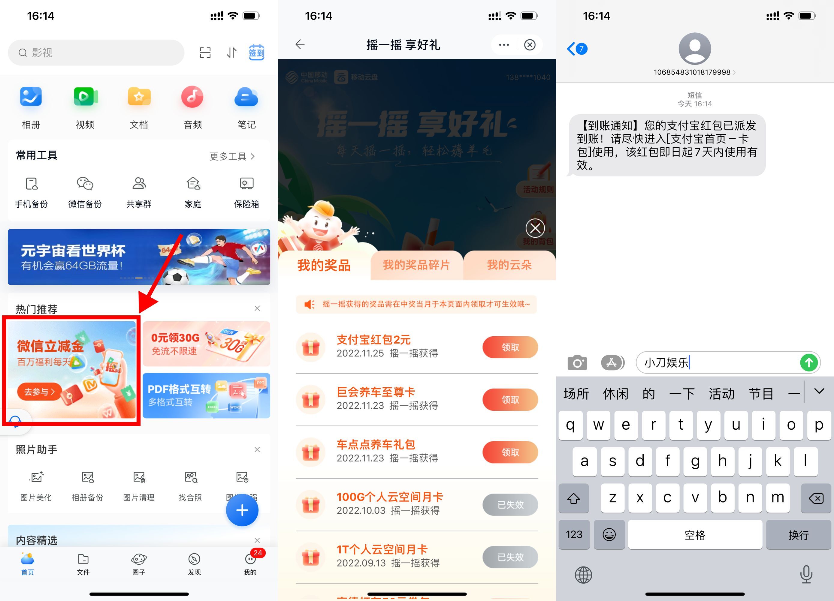 活动流程:目前有水,三网用户均可参与!移动云盘APP最新版->首页横幅进入->每天摇一摇抽支付宝红包、微信立减金、视频会员等。